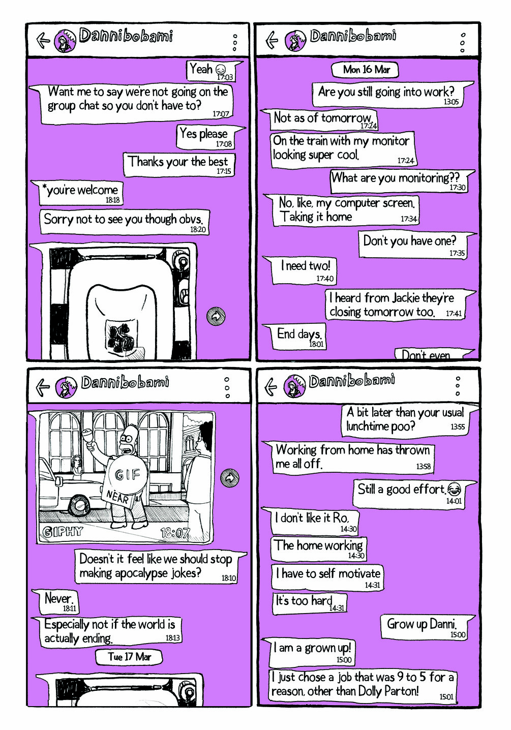 This 32 page comic follows the instant messages between those two women out of Biscuits (Assorted) that send each other pictures of their poo. It's not all about poo though. It's mostly just a record of a mostly adequate friendship, during a pandemic. With memes and jokes.