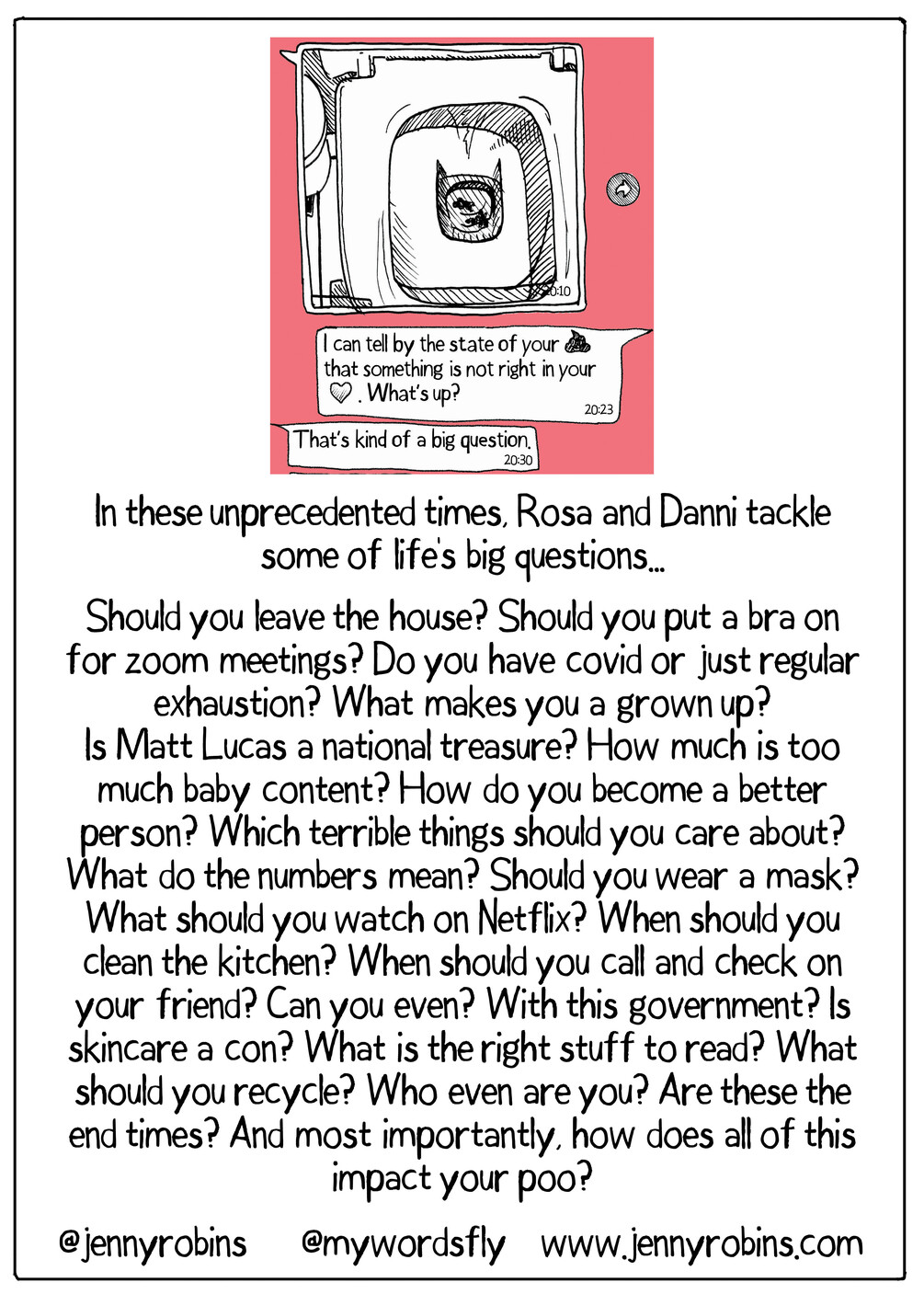 In these unprecedented times, Rosa and Danni tackle some of life's big questions... Should you leave the house? Should you put a bra on for zoom meetings? Do you have covid or just regular exhaustion? What makes you a grown up? Is Matt Lucas a national treasure? How much is too much baby content? How do you become a better person? Which terrible things should you care about? What do the numbers mean? Should you wear a mask? What should you watch on Netflix? When should you clean the kitchen? When should you call and check on your friend? Can you even? With this government? Is skincare a con? What is the right stuff to read? What should you recycle? Who even are you? Are these the end times? And most importantly, how does all of this impact your poo?